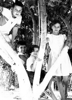 Σ’ ένα δέντρο (είμαι στο βάθος) με τα ξαδέλφια μου (Γιάννη, Μαίρη και Λιλή).