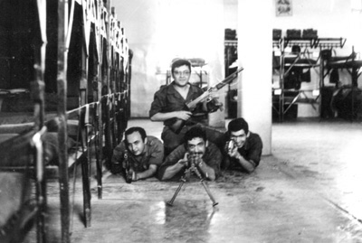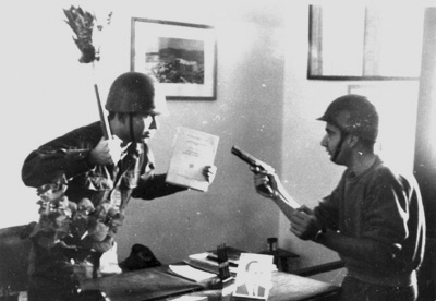 Κάνοντας «αντιστασιακή» πλάκα, μπροστά στη φωτογραφία του Παπαδόπουλου και κρατώντας το «Πιστεύω» του, στο γραφείο του Διοικητή της Μονάδας (φυσικά, όταν εκείνος έλειπε). Τι μπορεί να πάθει κάποιος 21 μήνες «μέσα»…